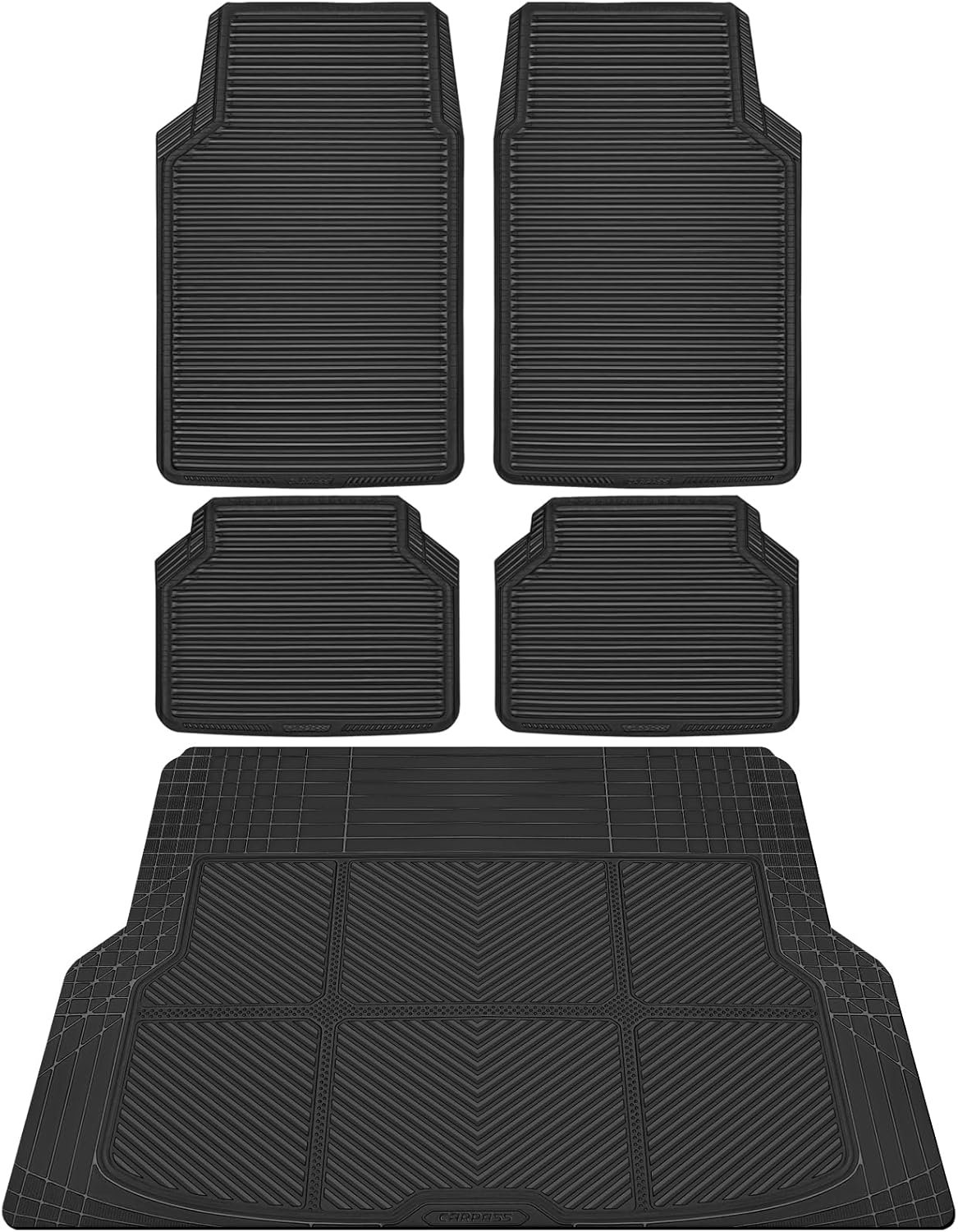- All Weather All Season Protection: all black rubber car floor mats & cargo liners use for all season.Easy to clean.ridge channels specifically design to prevent fluids from leaking onto carpets,the deep channels also trap any mud, dirt, water or snow that gets in your car
